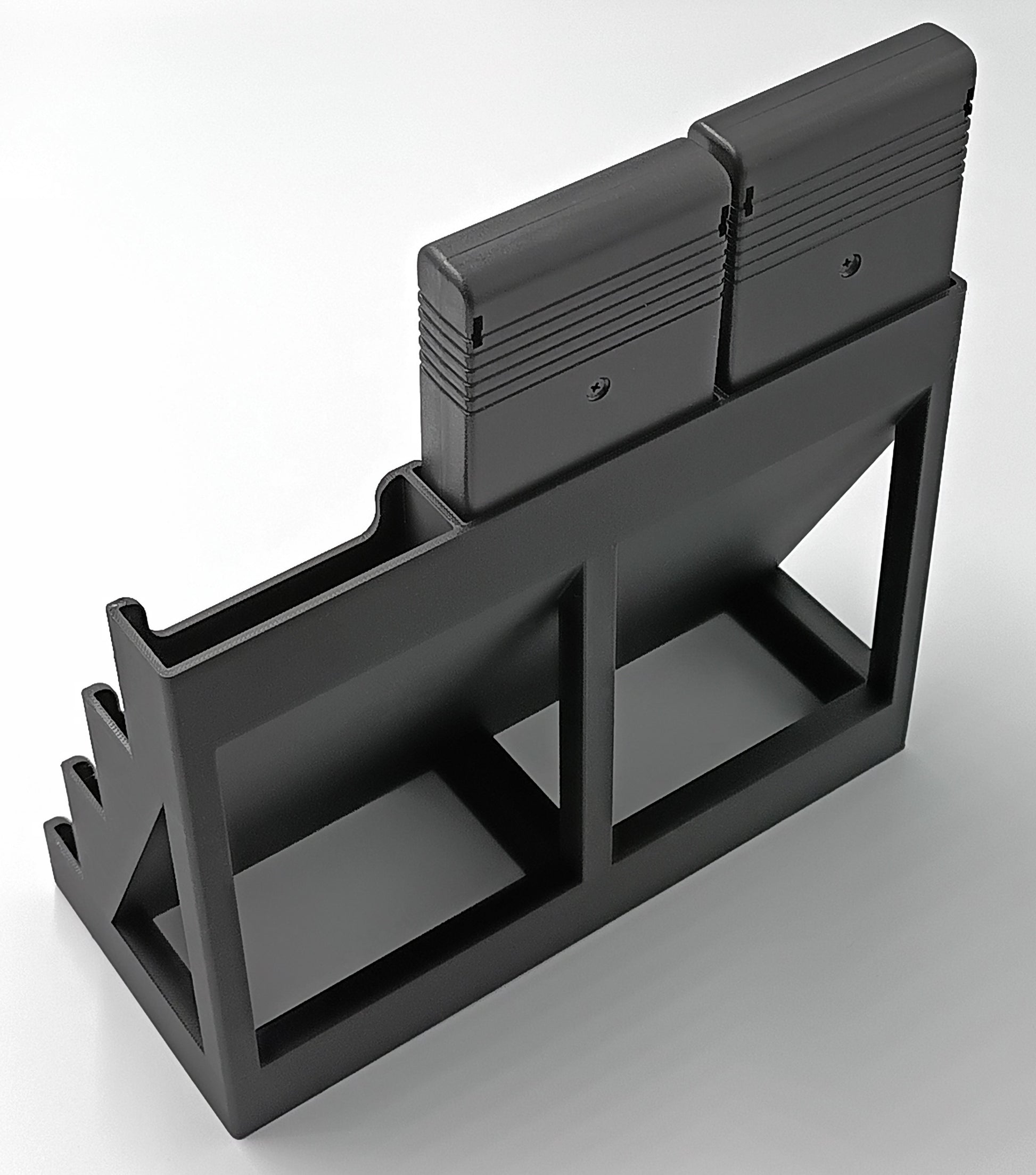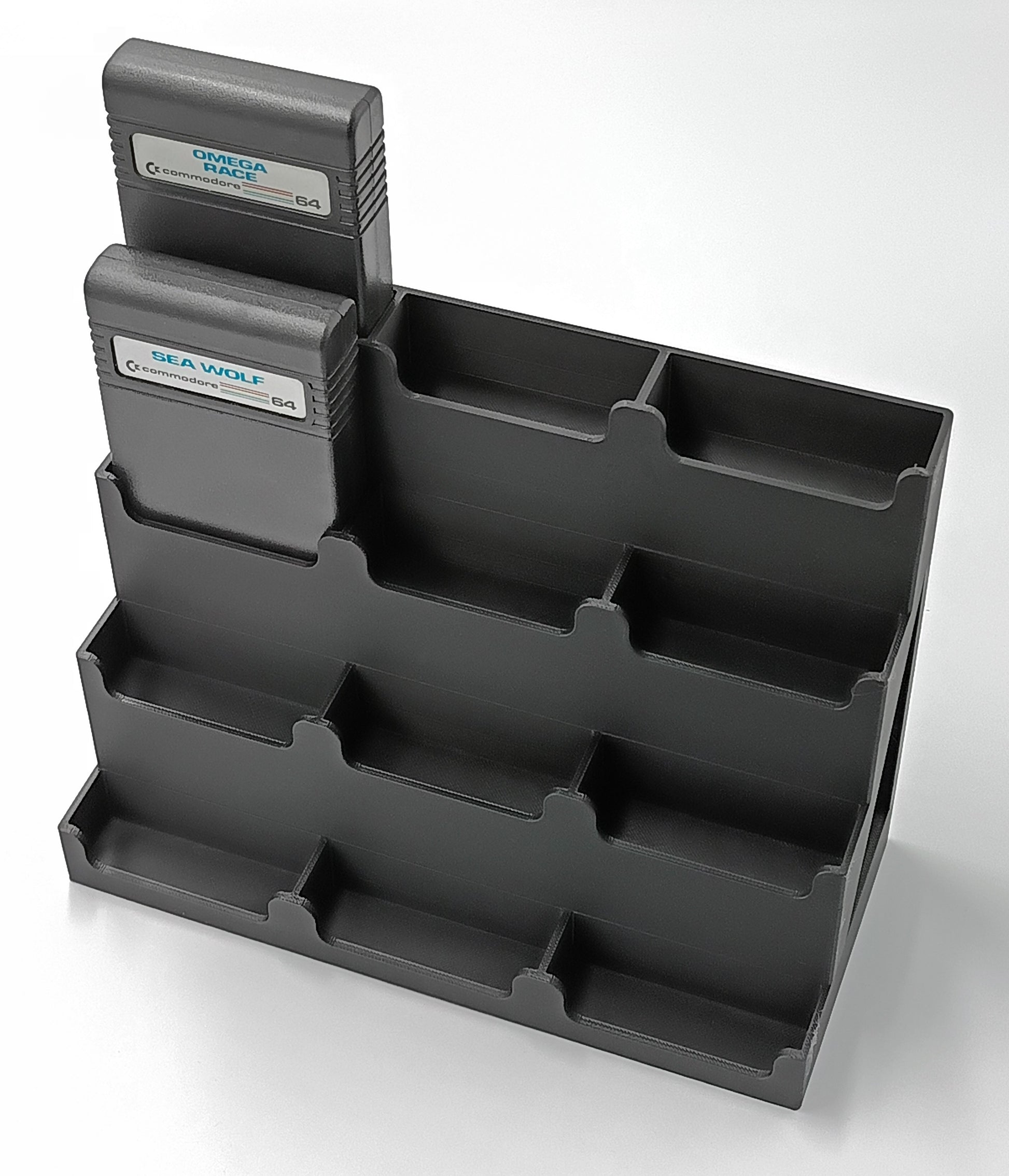 For sale is a display tower for Commodore 64 cartridges. It holds 12 games in the slots. It is designed only for the Commodore branded cartridges, so it will fit those or smaller only.