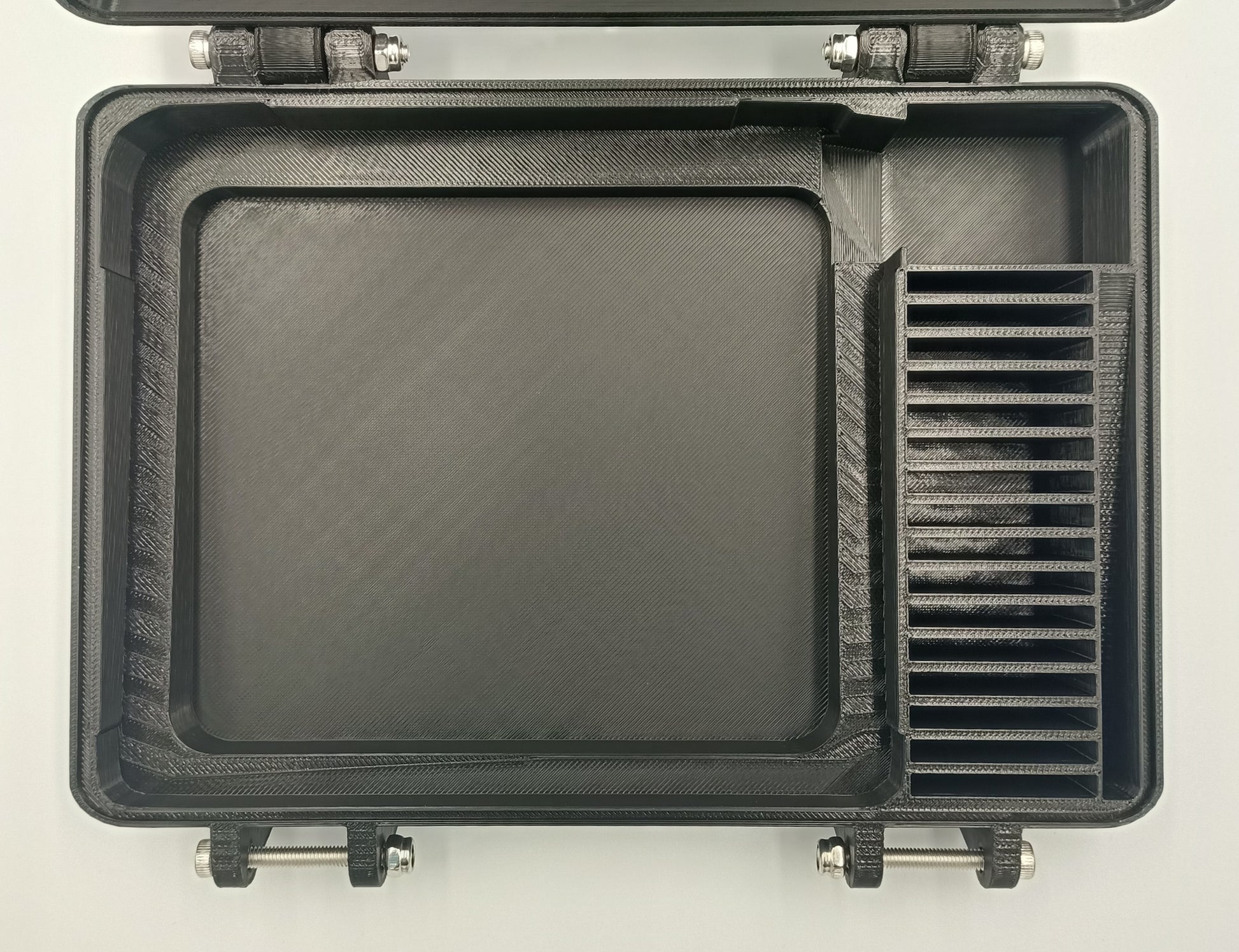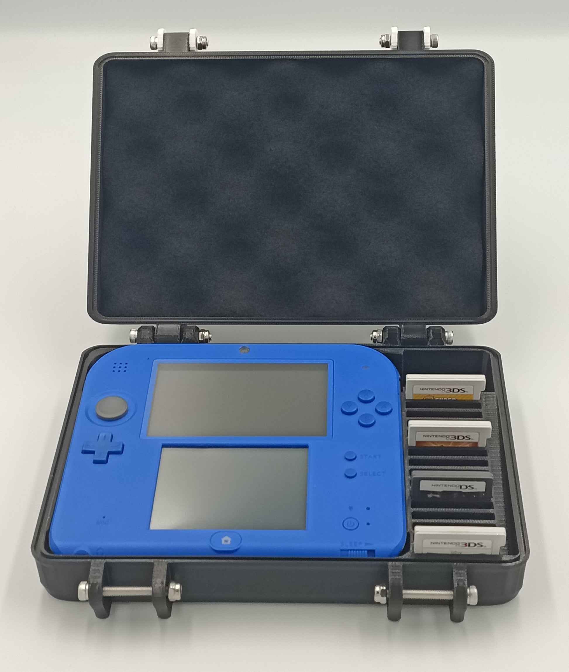 This is a rugged hard plastic design and everything has a tight and proper fit designed using 3d models of the cartridges and console, so everything will remain secure while traveling without movement. The hinges for the main body and clamps use stainless steel m4 bolts with nylon locking nuts to ensure that they won't loosen over time. The black latches were made to be extra durable. This ensures that they will last a long time.