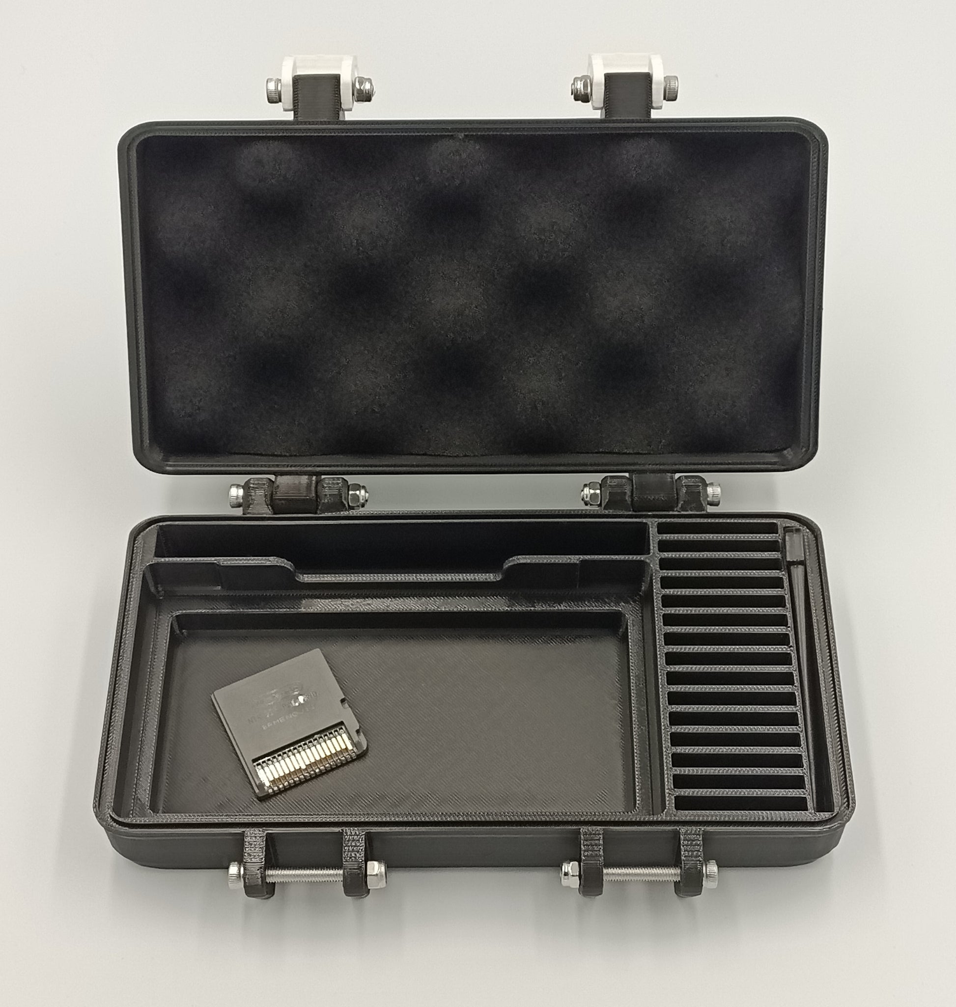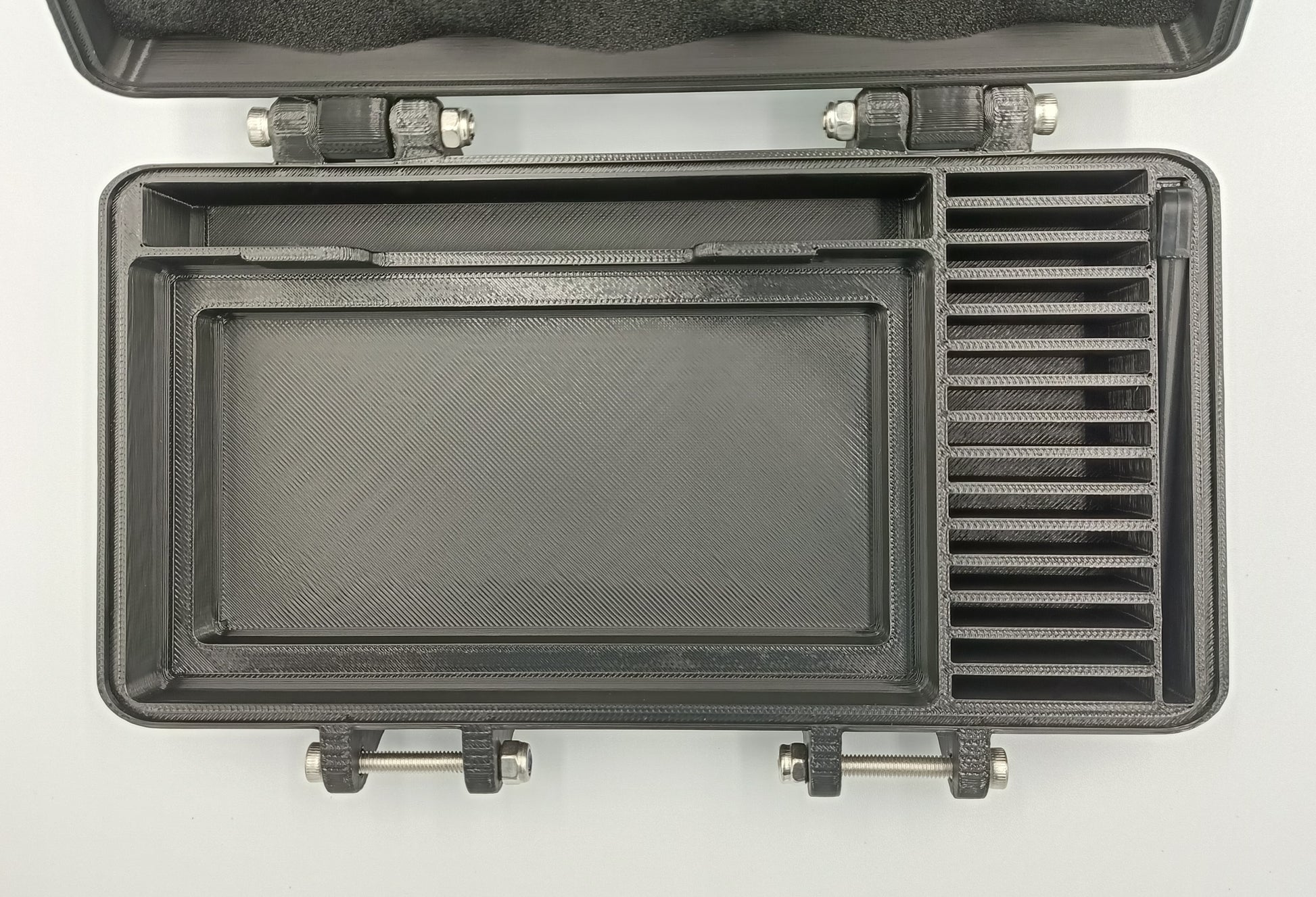 This is a rugged hard plastic design and everything has a tight and proper fit designed using a 3d model of the console, so it will remain secure while traveling without movement with only gentle force on the console. The hinges for the main body and clamps use stainless steel m4 bolts with nylon locking nuts to ensure that they won't loosen over time. The latches were made to be extra durable. This ensures that they will last a long time.