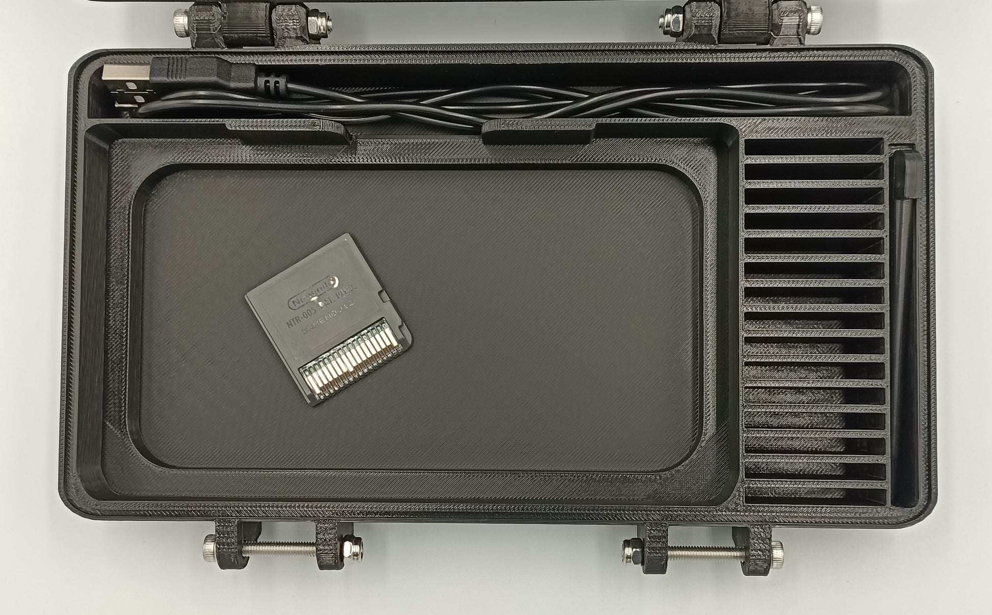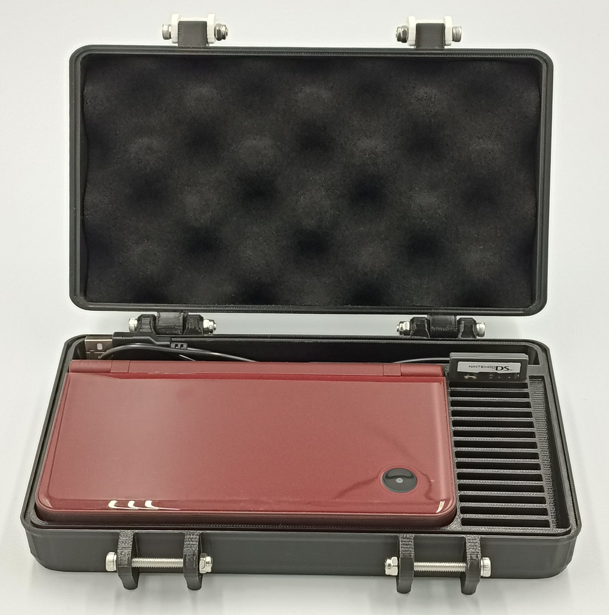 This is a rugged hard plastic design and everything has a tight and proper fit designed using a 3d model of the console, so it will remain secure while traveling without movement with only gentle force on the console. The hinges for the main body and clamps use stainless steel m4 bolts with nylon locking nuts to ensure that they won't loosen over time. The latches were made to be extra durable. This ensures that they will last a long time.