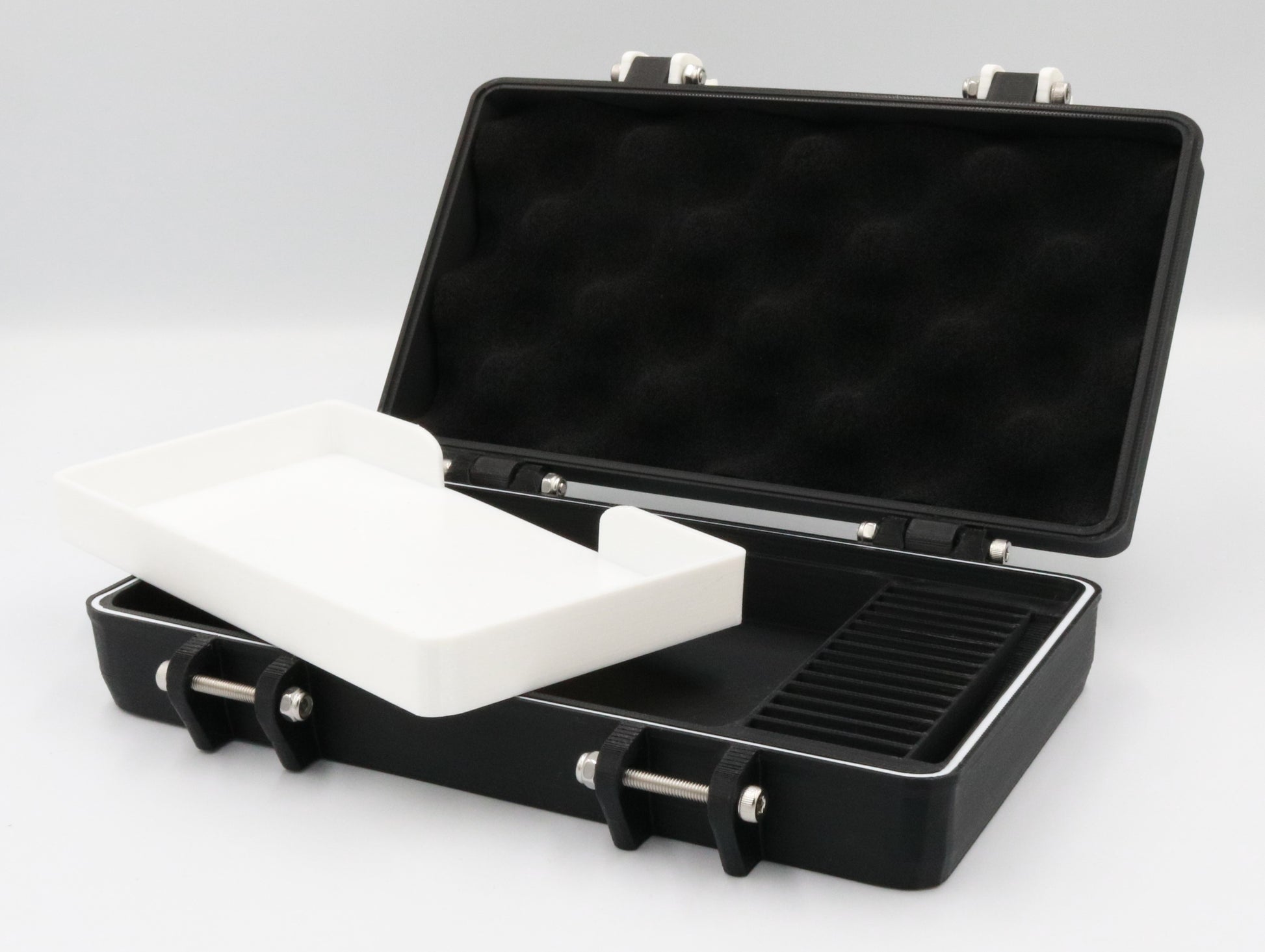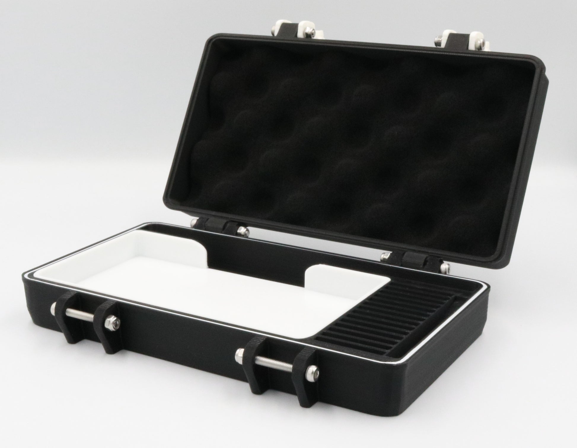 Precision-designed protective case featuring a removable 2mm TPU cushion, o-ring, game storage, USB/accessory compartment, and a stylus slot.