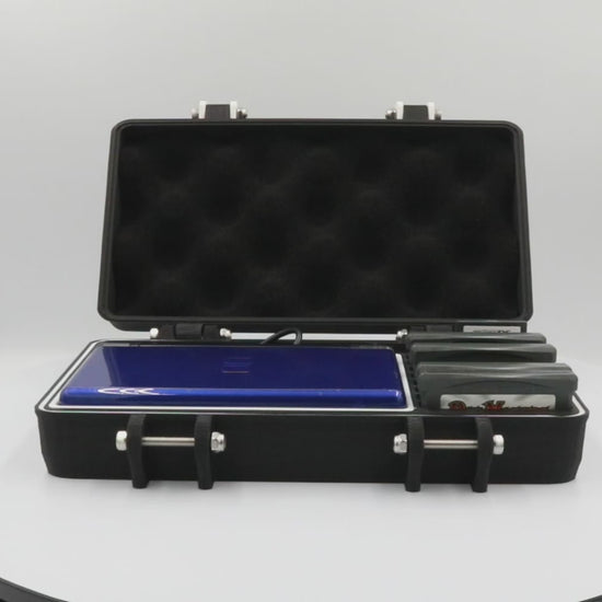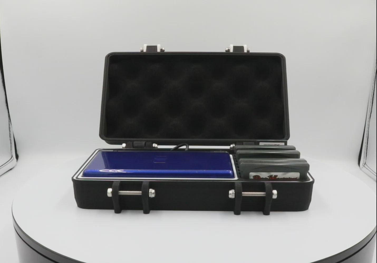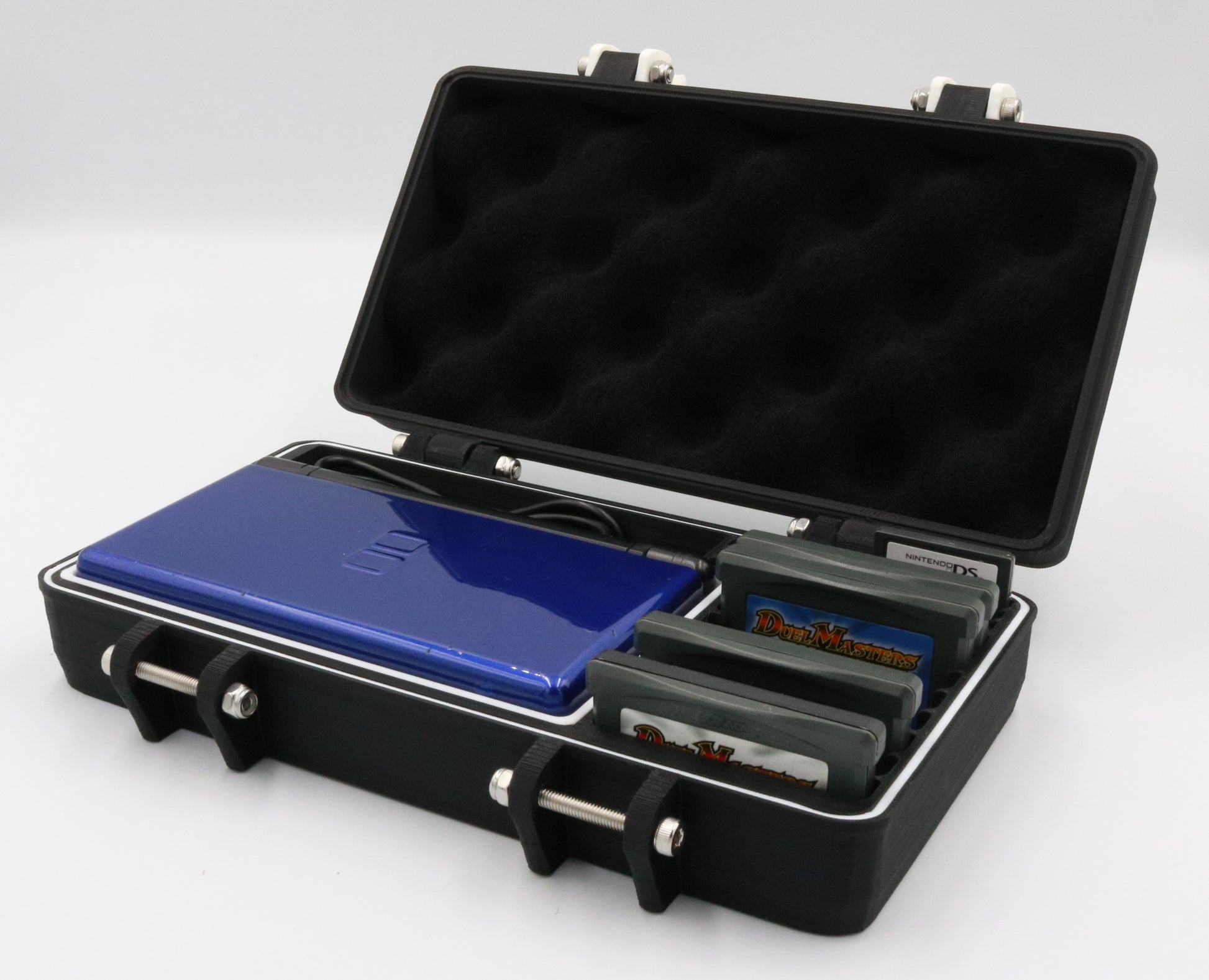Precision-designed protective case featuring a removable 2mm TPU cushion, o-ring, game storage for GBA and DS games, and a USB/accessory compartment.