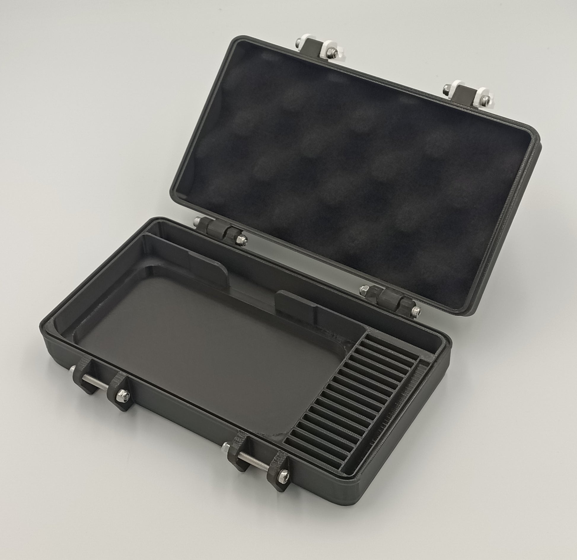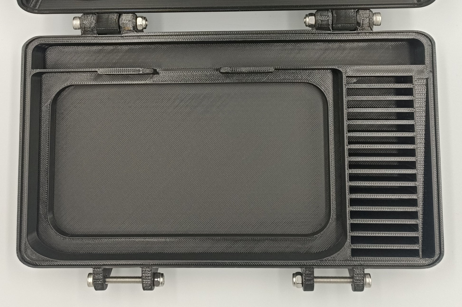 This is a rugged hard plastic design and everything has a tight and proper fit designed using a 3d model of the console, so it will remain secure while traveling without movement with only gentle force on the console. The hinges for the main body and clamps use stainless steel m4 bolts with nylon locking nuts to ensure that they won't loosen over time. The latches were made to be extra durable. This ensures that they will last a long time.