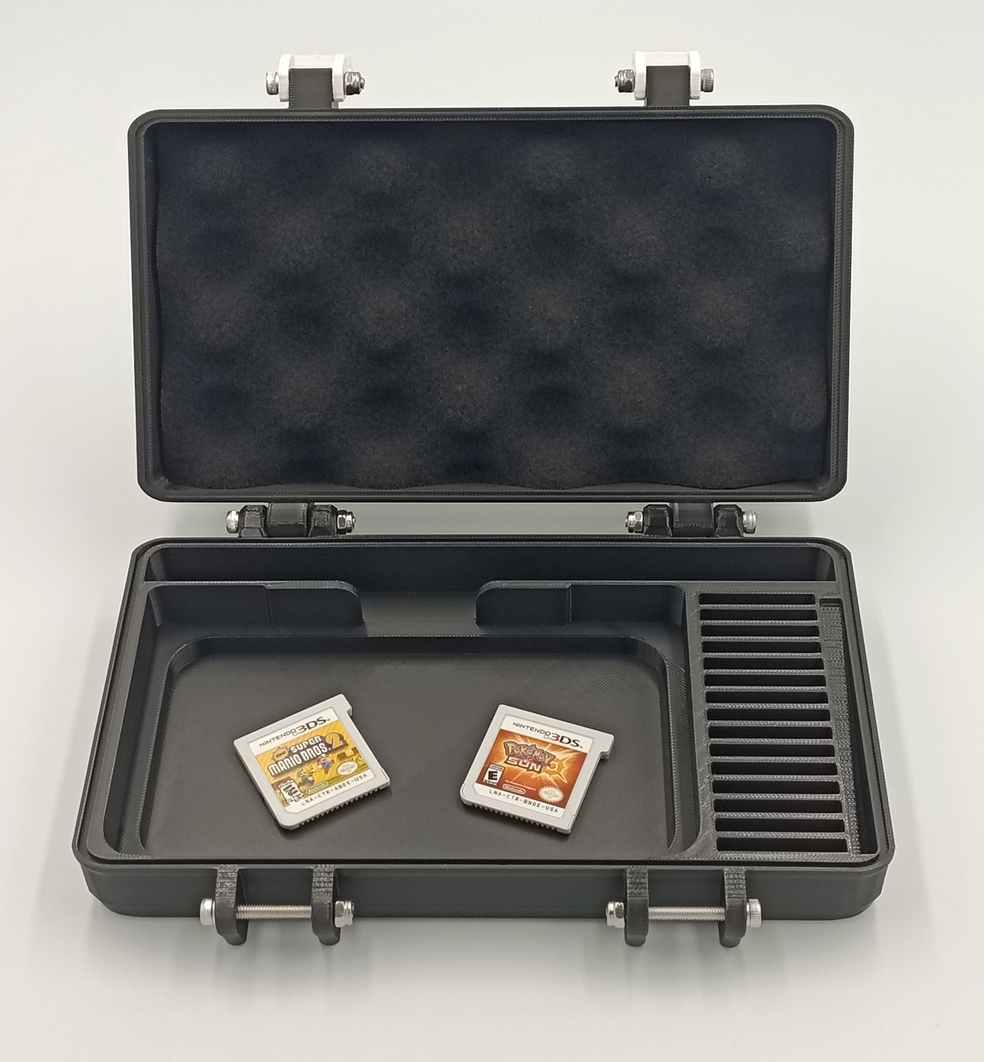 For sale is a carrying case for "Old" Nintendo 3DS XL. It holds 15 games in the normal slots and 1 game would fit in the Nintendo 3DS XL, for a total of 16 games. Has a slot on the right for an extra stylus and a storage space in the back for a USB cable. Underneath the system is more storage space.