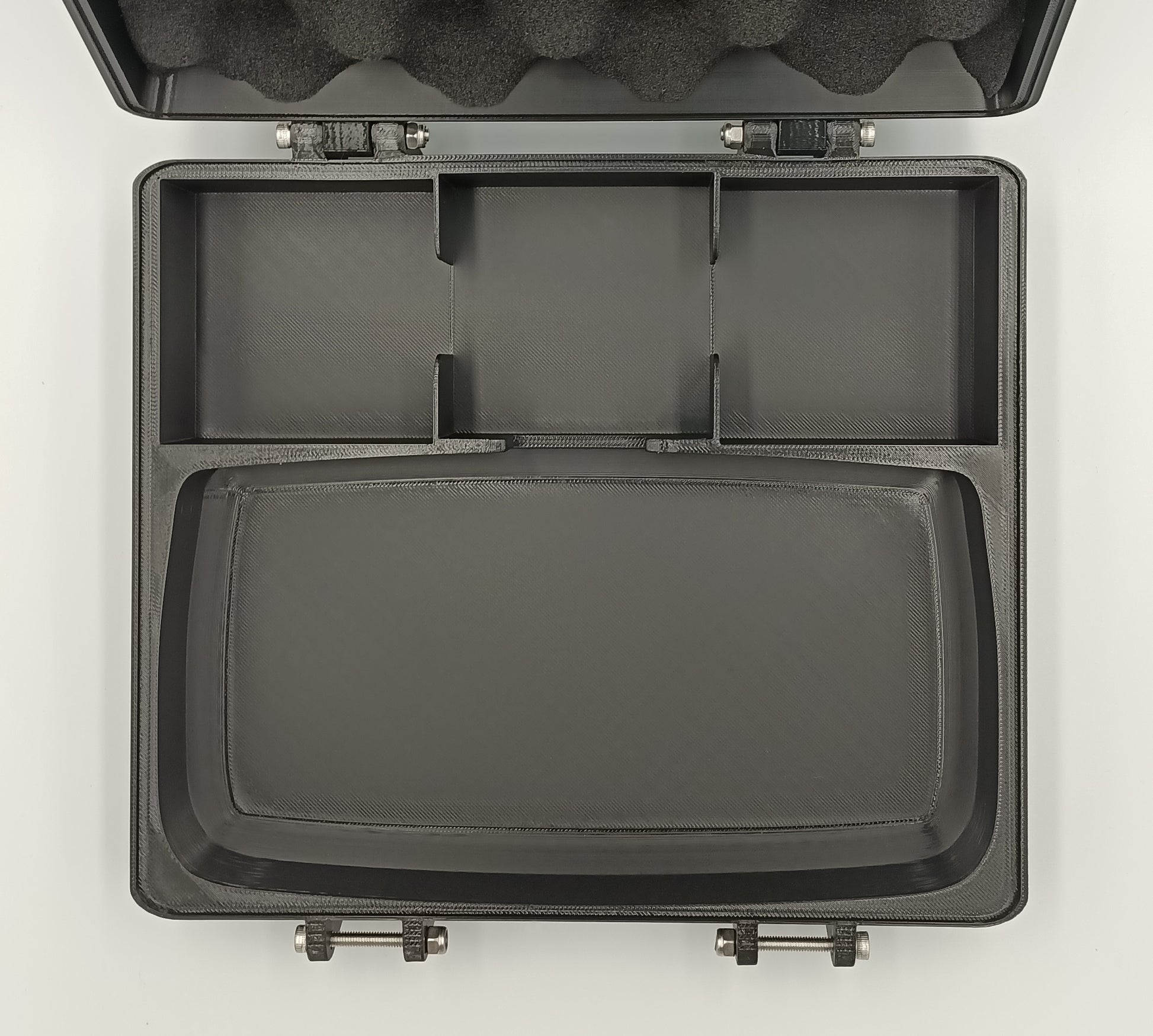 This is a rugged hard plastic design and everything has a tight and proper fit designed using 3d models of the cartridges and console, so everything will remain secure while traveling without movement. The hinges for the main body and clamps use stainless steel m4 bolts with nylon locking nuts to ensure that they won't loosen over time. The white latches were made to be extra durable. This ensures that they will last a long time.